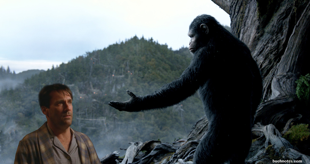 Upon returning to a scorched Earth and discovering everyone he’s ever known and loved has either been killed by a viral pandemic or at the hands of a blood-thirsty ape, Don Draper retreats to a cave where he spends the bulk of the first act futilely shoving his penis into any hole that presents itself, praying for a release that can never come. When ape-leader Caesar stumbles upon Draper’s lair, Draper’s first instinct is to have sex with him. When that doesn’t work, Draper further retreats into an even deeper cave.